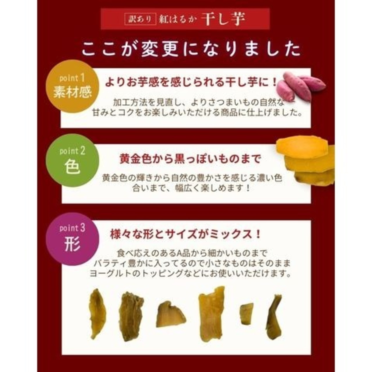 当店の売れ筋人気No.1訳あり紅はるか干し芋は、サイズ感や食感、色にばらつきがあるため、訳あり価格でご提供しています。しかし、その不揃いさがむしろこの干し芋の魅力。形や大きさが異なることで、紅はるかの自然な味わいや異なる食感が楽しめます。